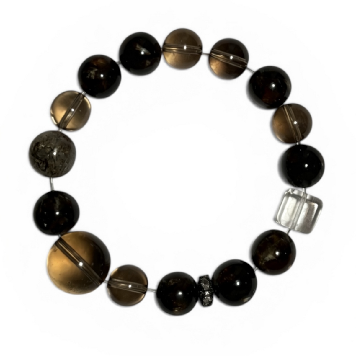 黒雲母を軸に、ブラックスーパーセブン、茶水晶、白水晶を組み合わせた一点物ブレスレットです。落ち着きと存在感を併せ持ち、ビジネスシーンや日常の装いにも自然に馴染みます。