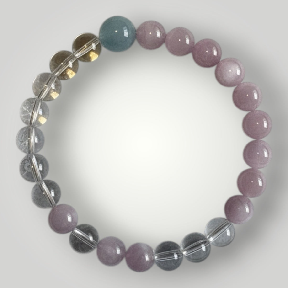 クンツァイトのやさしい色合いとアクアマリンの清涼感を、白水晶が美しくつなぐ一点物ブレスレットです。女性の日常使い、ギフト、上品なコーディネートにおすすめです。